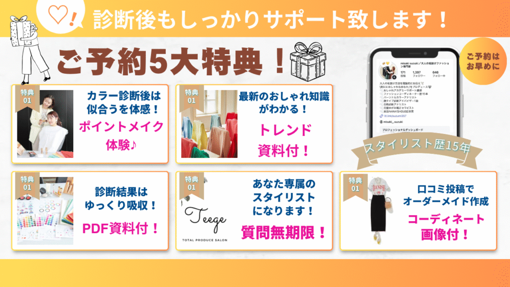 サロンでは、診断を「その日だけの体験」で終わらせず、その後の毎日のおしゃれにしっかり活かしていただくことを大切にしています。
