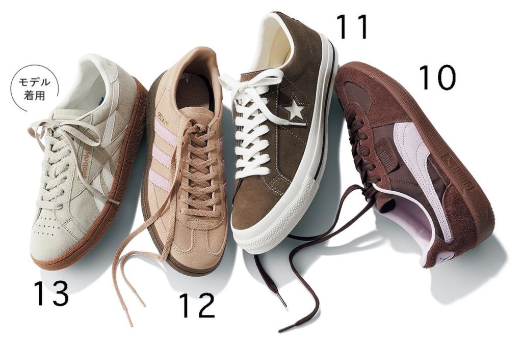 まず、ローテクスニーカーはどんなコーデにも調和しやすく、上品さをプラスできる万能アイテム。