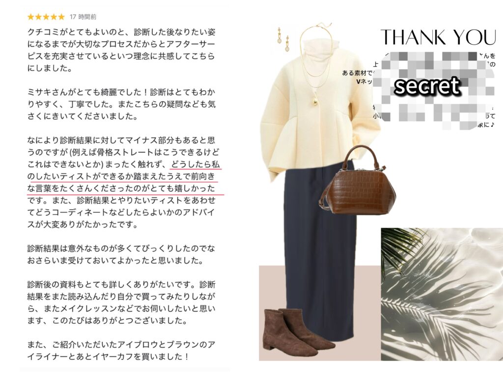 当サロンでは、診断結果と雰囲気、トレンドを掛け合わせたオーダーメイドのコーディネート画像を口コミ特典としてお渡ししています。