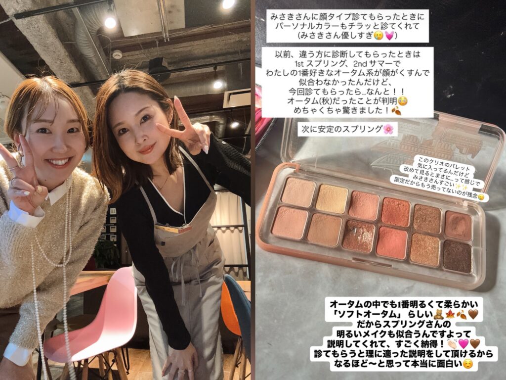 “ソフトオータム”らしい!だからスプリングさんの明るいメイクも似合うって説明してもらえて、すごく納得しました。理にかなった説明をしてもらえるから“なるほど〜”の連続で本当に面白かったです」とのお声。